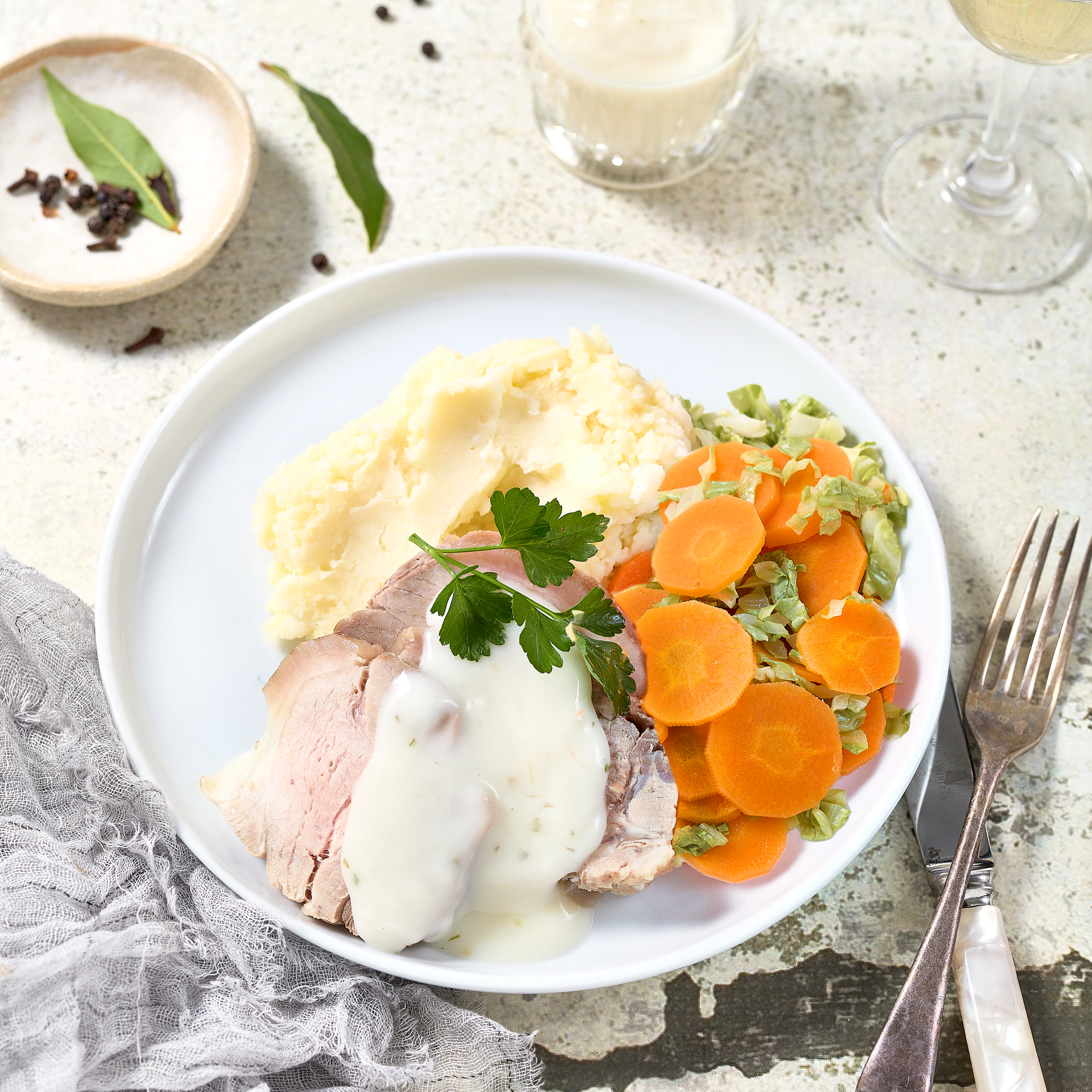Slices of pickled pork in a creamy mustard sauce served with mashed potato, carrots and cabbage